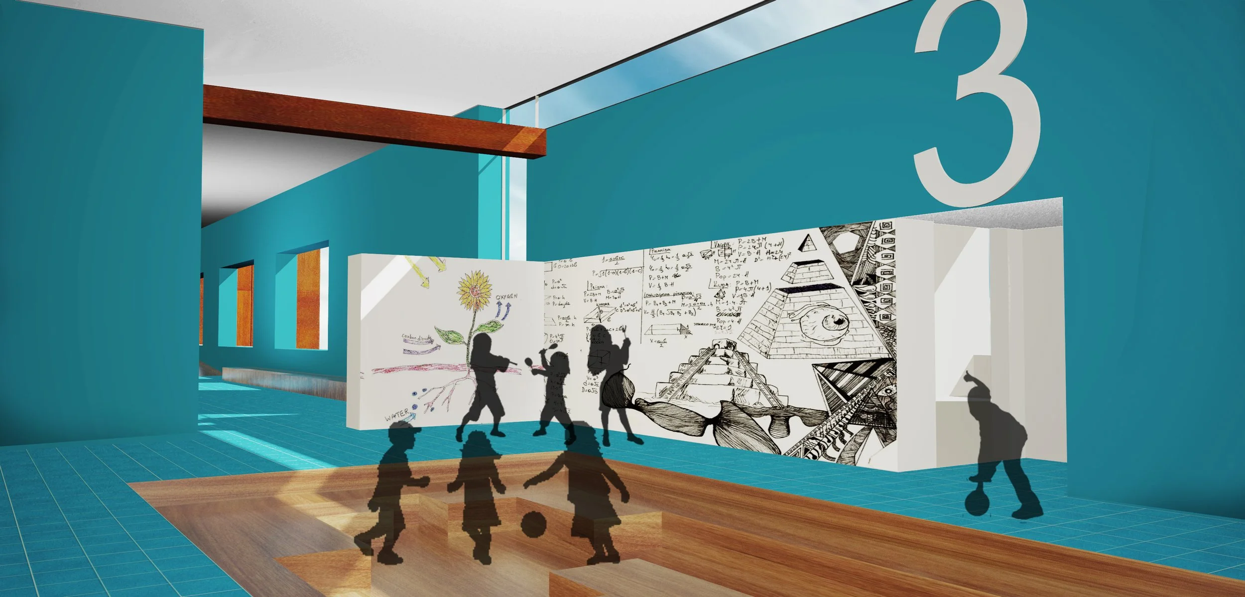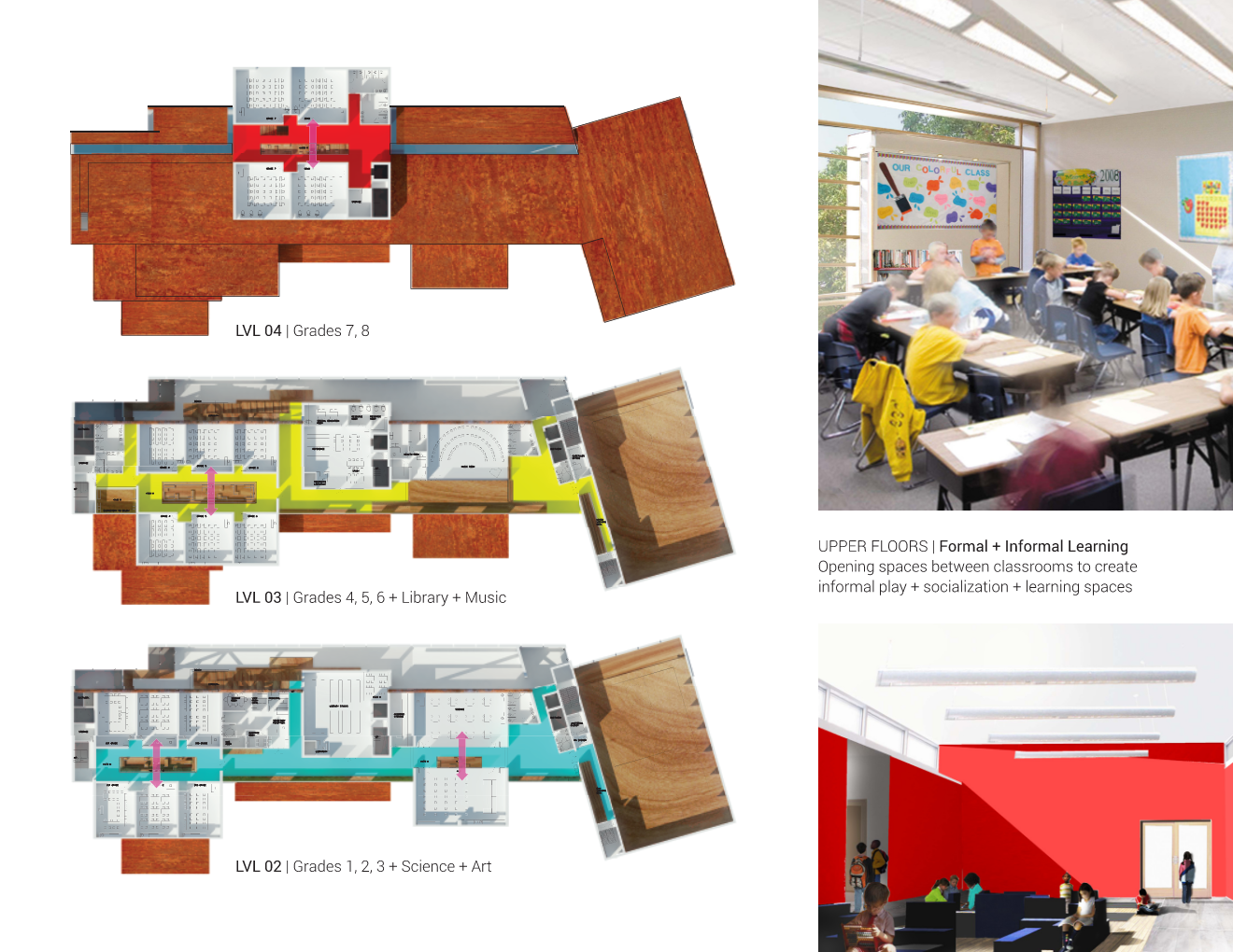 This project is based on the notion that play is the beginning of education. To create the maximum amount of opportunity for play, typical school program has been expanded to include an indoor and outdoor topography which marks areas in-between the class-rooms for informal student interaction.