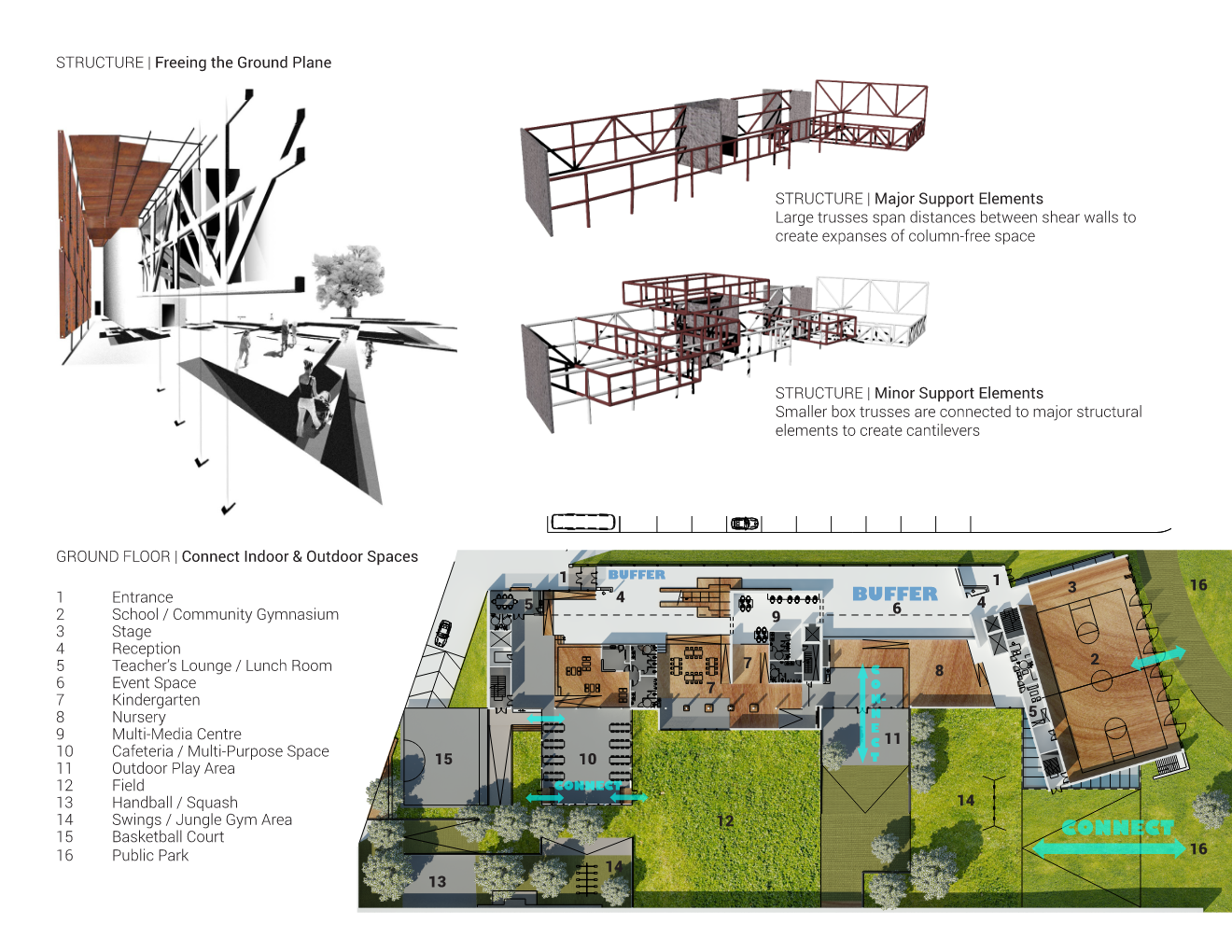 Distinct spaces are created through a slight changes in elevation. Ramps and steps mark the artificial nature man-made recreational areas of the site. The building massing maintains an institutional sized front and a child sized backyard.