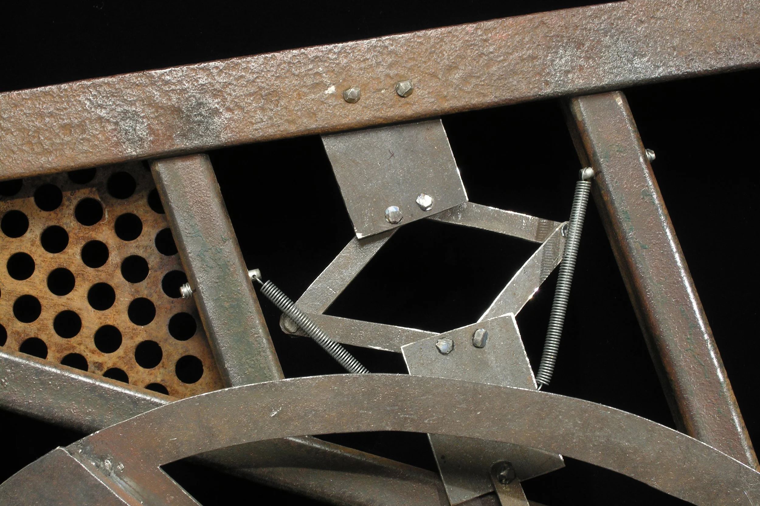 As an interpretation of this interactivity, I created a sculpture with a handle: inviting the viewer to transform the work. Springs, riveted joints, and cables allow the sculpture to transform between its open and closed position. Institial space in the painting is reinterpreted as a screen, indicating a tactility that relates to "occupation" of the space in and around the objects. The rusted iron gives color, texture, and smell to the object, lending a subtle sensory interaction to the piece.