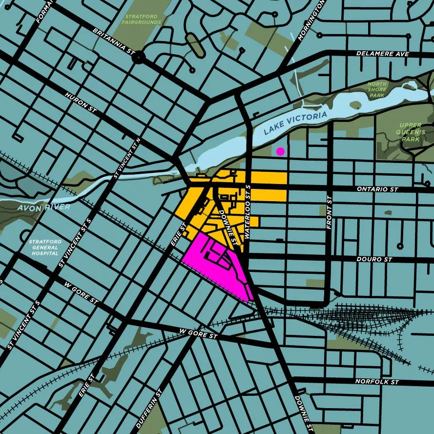 The site (pink) is directly adjacent to, and nearly half the size of, downtown Stratford (yellow): revitalizing the Big Shop would transform the downtown. The pink dot indicates the location of The Festival Theatre.
